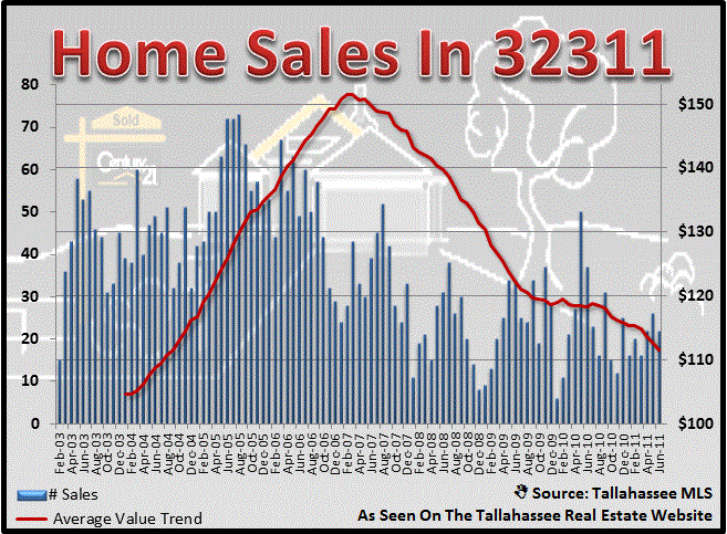 Home prices in the 32311 zip code at are on the decline, though they were buoyed for quite some time with new home construction sales in Southwood. The average price of a home has dropped from over $270,000 at the peak of the market to just $171,000 in June. Currently, the average price trend of homes selling in the 32311 zip code is over $200,000, but with recent sales in the $170K range, we can expect the decline to resume.