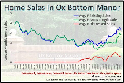 Currently, there are 17 homes for sale in Ox Bottom Manor, which at the current rate of sales means that sellers are getting sold faster than at any time in the past seven years.In the real estate graph above, the average number of existing home sales each month is shown in blue, while the average number of arms length home sales are shown in green, and the average number of distressed home sales are shown in red.