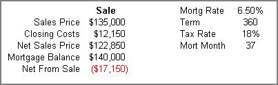 It is most likely that we can negotiate with the lender to work out a note for Jim for the $17,150 difference (short sale) in selling the property. This would mean Jim would not have to bring the money to closing, rather he could “owe” it to the lender. We will assume that we can work out a 30 year repayment plan, at 0% interest for Jim. That would equate to $47.64 per month for the next 30 years.