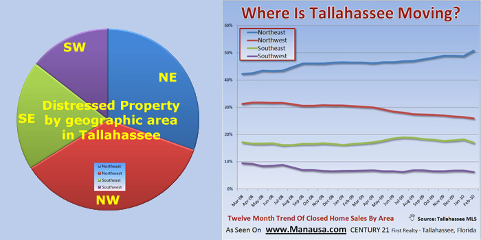 The interesting observation from the graphs above is that we know more than 1/2 of the sales are occurring in Northeast Tallahassee, but less than 1/3rd of the distressed properties are located there. I’m wondering if this abundance of distressed properties on the western side of Tallahassee will have an effect on moving trends, or if the recovery period for the west will just take that much longer. Time will tell.