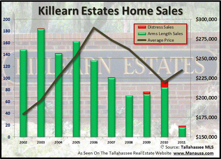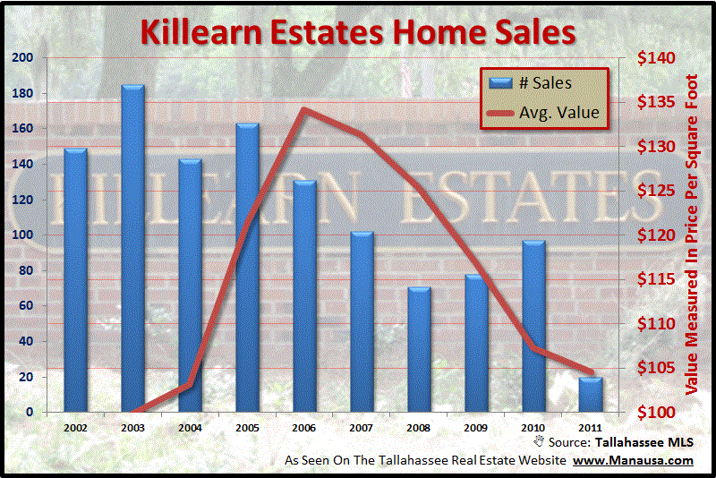 The fact that buyer activity is slowing in Killearn Estates comes as no big surprise, and the fact that Killearn home values are declining is no any different than the rest of the Tallahassee real estate market. The biggest surprise to me is the rapidly rate of decline in homes sold, as Killearn Estates is one of the most popular destinations for homebuyers in the entire Tallahassee housing market.