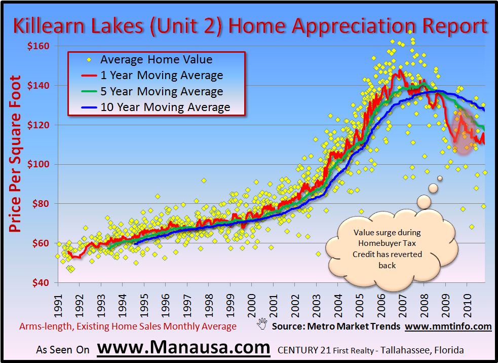 The bubble cloud points to a short-term appreciation period that occurred during the Homebuyer Tax Credit, but once that program came to an end, all of the gains were given back up. Currently, the trends indicate that we will see much more depreciation in Unit 2 of Killearn Lakes for the foreseeable future.