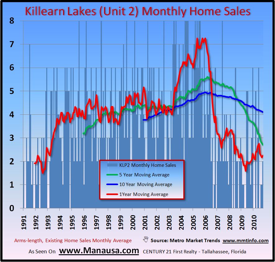 Monthly home sales in Killearn Lakes (Unit 2) have fallen to levels similar to 1993, and the impact of the Homebuyer Tax Credit appears to be mostly negated at this point. This popular Northeast Tallahassee neighborhood is seeing home sales each month at a rate that is only 30% of where it was in 2006 at the peak of the housing market.