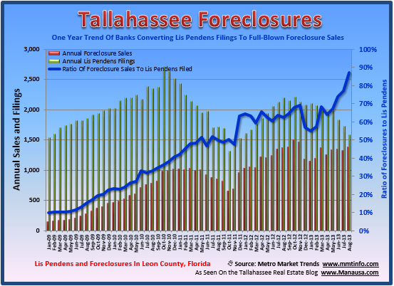 The continuing decline in new lis pendens filings is exciting, as we continue to seek lower levels in order to progress in the resolution of distressed properties. The blue line in the graph below shows that nearly 90% of all filings are ending up in foreclosure sale, indicating falling success with short sales due to the speed of approval of the bank.Tallahassee Foreclosures Filings August 2013