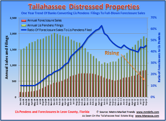 New lis pendens filings in Tallahassee fell 28% in September when compared to September 2011, but foreclosure sales jumped by 23%. This is the first sign of slowing for new filings in a year, which is great news, but there are still a lot of distressed properties moving towards the Tallahassee real estate market.