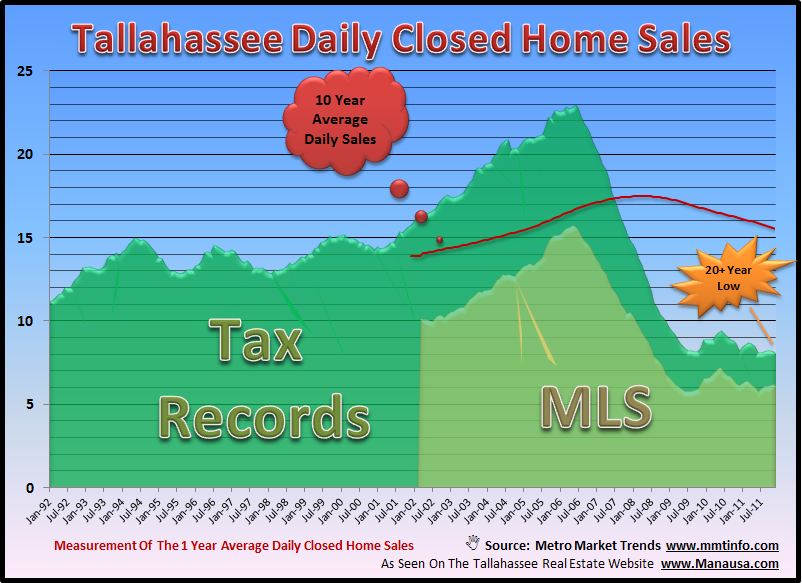 As we see our pending home sales decline, it is only natural to assume that we will see a similar effect on the closed home sales in Tallahassee. The following real estate graph shows that closed homes sales are still above the housing market bottom established in August 2009, but we have three more months before the anniversary of the end of the Homebuyer Tax Credit home closings.