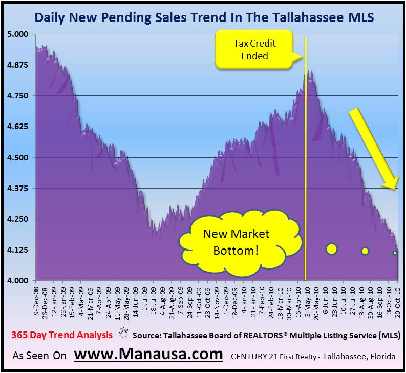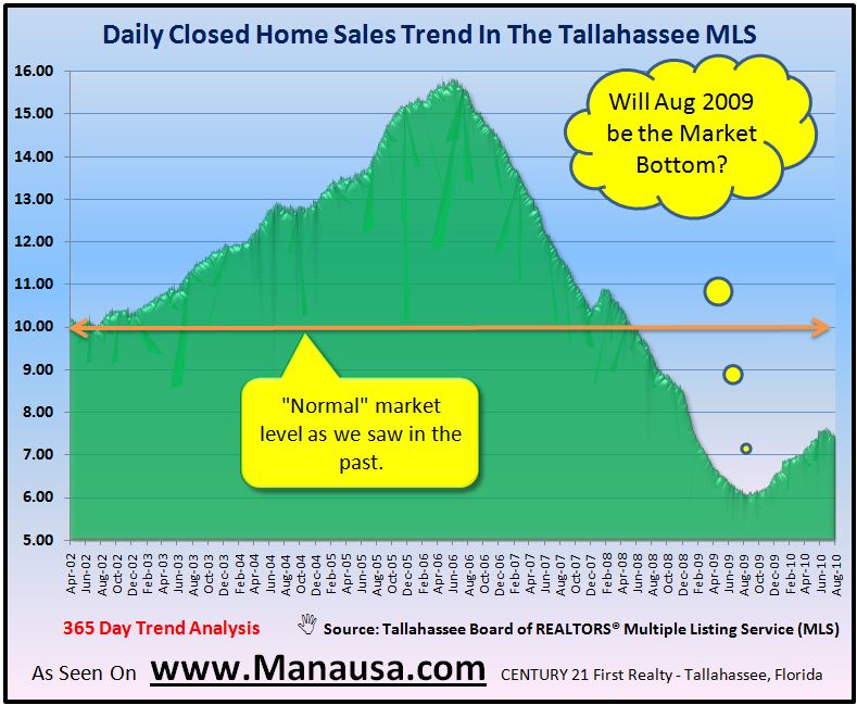 Observing daily closings in the Tallahassee housing market allows us to keep a close eye on the trend of buyer activity. This trend had been improving for nearly a year, but has definitely reversed direction since the end of the stimulus package.