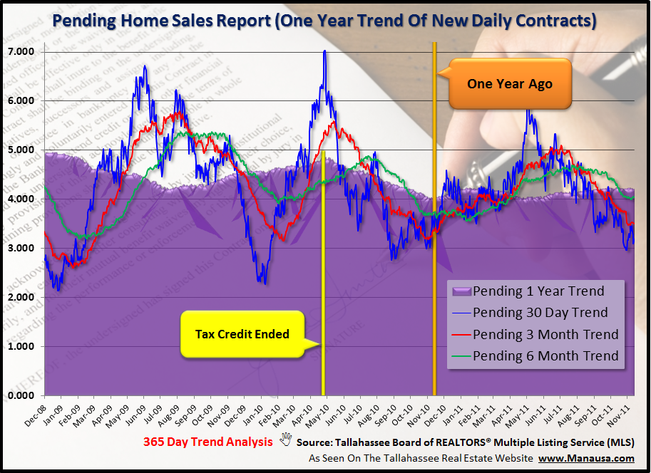 In graphical report on real estate above, the field of purple measures the one-year trend of pending home sales every day in the Tallahassee MLS. That means that any point you choose on the graph, the purple field reports 365 days worth of information (averaged to 1 day) and thus all seasonality has been removed. The current on year trend is on the decline most recently.