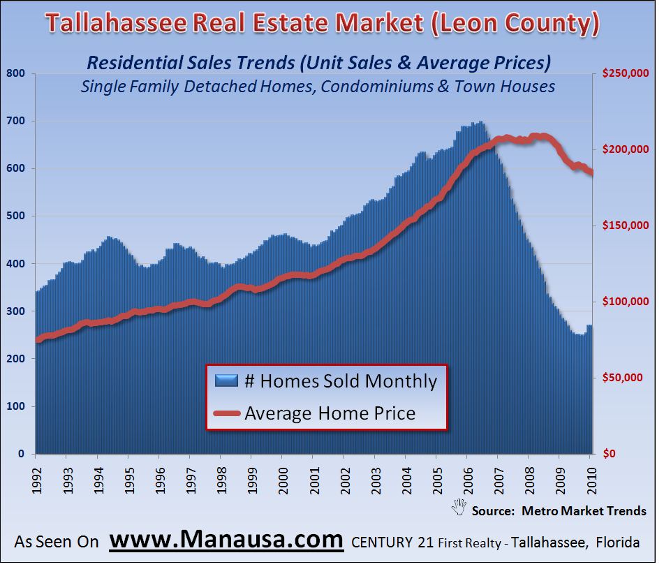 The Residential Sales Trends graph shows us historic home sales levels in Tallahassee. The blue vertical bars show the monthly unit sales trend, while the red line shows the average price trend. Our graph shows increasing unit sales and decreasing prices. We should see these trends continue until the market reaches equilibrium.