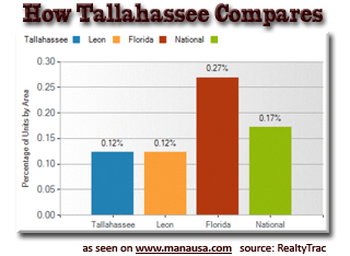 That‘s a Tallahassee short sale. As you can see from the graph on the right, the explosion of foreclosures is not something isolated in Tallahassee. Even though a third of our housing market consists of distressed properties, Tallahassee is below the average for Florida and the rest of the US housing market. This problem is not going to go away any time soon.