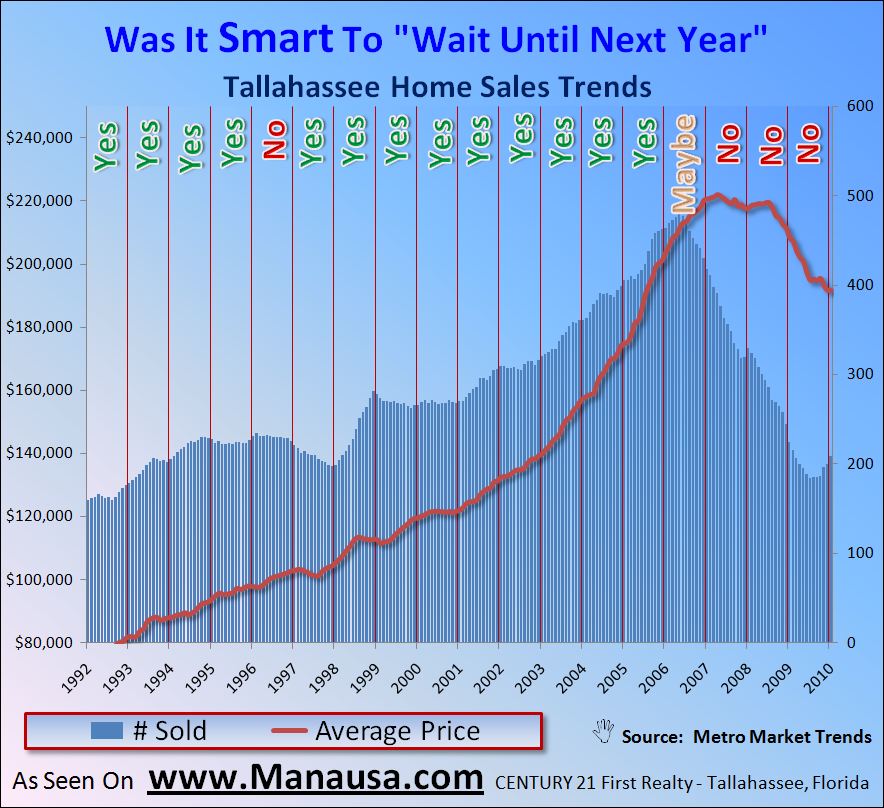 If we look at a real estate graph of home sales and average home prices, we can determine whether a “wait until next year” decision was wise for a homeowner.