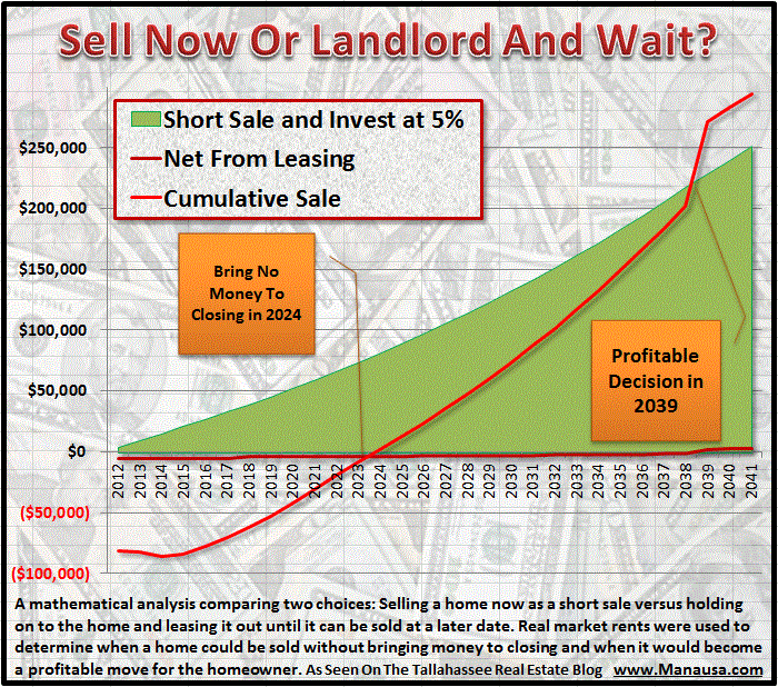 Recently, a friend of mine asked me “what is a short sale going to do for me versus me just renting out the home until it can be sold without a loss? Rather than just explain it to him, I decided to use this often asked question as the basis for a real-world real estate case study. The following analysis was performed to help him make a decision, and the numbers used come straight from today’s Tallahassee real estate market. I suspect most markets would find similar results.